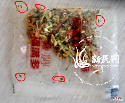 8月22日,新民网接一位江苏网友报料,称在还未打开的“福满多”桶面蔬菜包中发现多只活虫,网友还向新民网提供了照片。