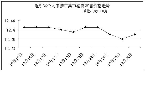 中新网10月29日电 国家发改委网站消息称,据国家发展改革委价格监测中心监测,上周(10.22-10.26,下同)全国36个大中城市猪肉(精瘦肉)集市平均零售价格每500克为12.39元,比上期(10.15-10.19,下同)下降0.08%。其中,12个城市猪肉价格小幅下降,其它城市猪肉价格与上期基本持平或略有上涨。