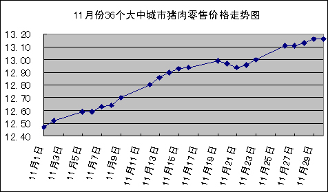 中新网12月3日电 国家发改委网站消息称,据国家发展改革委价格监测中心监测,上周(11.26-11.30,下同)全国36个大中城市猪肉(精瘦肉)集市平均零售价格每500克为13.13元,比上期(11.19-11.23,下同)上涨1.23%。