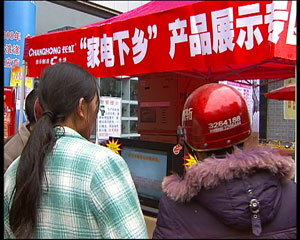 在四川采访的时候,记者发现当地几家大一些的商场纷纷打出了“家电下乡活动销售网点”的大幅宣传标语,彩电柜台上,很多品牌的彩电都把“家电下乡,国家补贴”的字样贴在了最醒目的位置,可是,一些规模小点的商场却感受到了压力,显然“家电下乡”不仅引发了农村的消费热潮,也无形当中带来了一场商战,但是,我们在这场本该热闹的商战中,也发现了一些不和谐的地方。