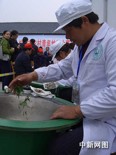 图为炒茶比赛现场。