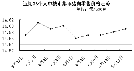 中新网4月14日电 中国国家发改委网站消息,据发改委价格监测中心监测,上周(4.7-4.11,下同)全国36个大中城市集市猪肉(精瘦肉)平均零售价格每500克为14.57元,比前一周(3.31-4.4,下同)下降0.14%。
