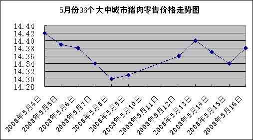 中新网5月19日电 中国国家发改委网站消息,据发改委价格监测中心监测,上周(5.12-5.16,下同)全国36个大中城市猪肉(精瘦肉)平均零售价格每500克为14.37元,比前一周(5.5-5.9,下同)略涨0.21%。