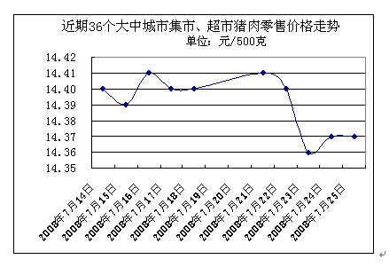中新网7月28日电 国家发改委网站消息,据国家发展改革委价格监测中心监测,上周(2008.7.21-2008.7.25,下同)全国36个大中城市集市、超市猪肉(精瘦肉)平均零售价格每500克为14.38元,与前一周(2008.7.14-2008.7.18,下同)相比下降0.13%。