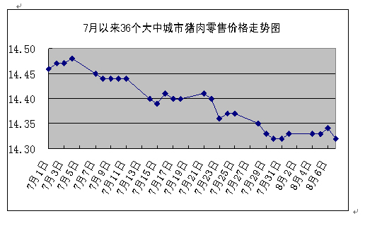 中新网8月11日电 据国家发改委网站消息,发改委价格监测中心监测显示,上周(8月4日~8月7日)全国36个大中城市集市、超市猪肉(精瘦肉)平均零售价格每500克为14.33元,与前一周(7月28日~8月1日,下同)持平。