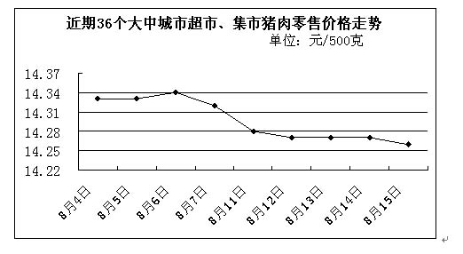 中新网8月18日电 据国家发改委网站消息,国家发改委价格监测中心监测显示,上周(8月11日-8月15日)全国36个大中城市超市、集市猪肉(精瘦肉)平均零售价格每500克为14.27元,比前一周(8月4日-8月8日,下同)下降0.42%。