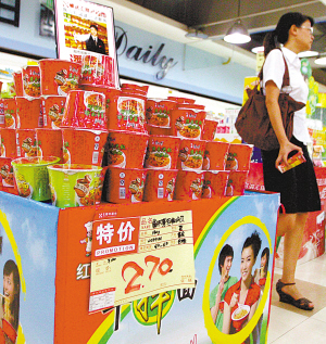 某超市一桶装方便面品牌打出降价招牌(资料图片)记者 毕克勤 摄