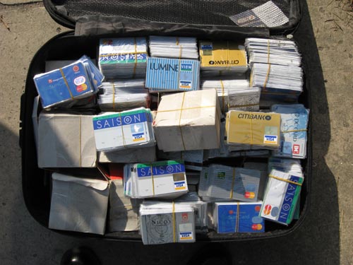 此刻,年轻女子略微犹豫了一下。当她抬头看到民警威严的目光时,只好停住脚步,蹲下身体将拉杆箱的拉链打开。就在女青年打开箱子的一瞬间,民警的怀疑更甚。原来里面全是信用卡,卡面上都是外文,而且来自不同的银行。信用卡被整整齐齐地码放在箱子中。