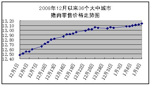 中新网1月12日电 据国家发改委网站消息,据国家发展改革委价格监测中心监测,上周(2009年1月5日~2009年1月9日,下同)全国36个大中城市集市、超市猪肉(精瘦肉)平均零售价格每500克为13.11元,与前一周(2008年12月29日~2008年12月31日,下同)相比上涨0.46%。