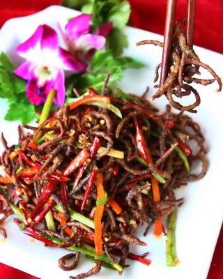说起蚯蚓这种扭曲的小虫,你的第一反应也许是肥美的鱼饵。不过,金堂赵镇的一家农家乐,却把蚯蚓摆上餐桌,经过油炸、爆炒,成为其招牌菜——“干煸地龙”,售价98元一份。这道有些古怪的菜品,吸引了不少猎奇的食客。昨日,记者走进这家农家乐的厨房,一探究竟。