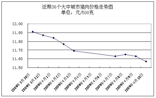 中新网4月13日电 据国家发展改革委价格监测中心监测,上周(2009.4.7-2009.4.10,下同)36个大中城市集市、超市猪肉(精瘦肉)平均零售价格每500克为11.62元,与前一周(2009.3.30-2009.4.3,下同)相比下降1.69%。