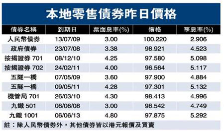 人民币债券首日买卖即录得溢价,反观票面息率较人民币债券为高的港元零售债券却全数录得折让,反映人民币债券具吸引力之余,亦可见市场对该债券的需求。