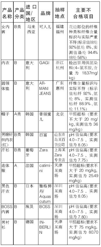 据了解,今年2月,国家质检总局组织北京、天津、上海、江苏、浙江、福建、山东、湖北、广东及深圳10地的检验检疫机构对进口婴幼儿服装和进口内衣实施了专项抽查。结果显示,不符合国家强制性技术规范的各种情况依然存在。纤维成分、pH值、游离甲醛含量、色牢度(耐水色牢度、耐酸汗色牢度、耐碱汗色牢度、耐干摩擦色牢度)、禁用偶染料、服装标识等项目均有不合格。其中,服装标识不符合规定的情况比较严重。