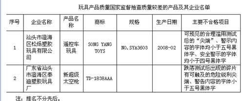 玩具产品质量国家监督抽查质量较差的产品及其企业名单