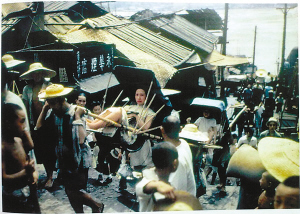 路边休息的力夫看上去十四五岁,穿着草鞋,坐在石梯上,皱着眉头,对着镜头憨笑。背着背篼的小男孩年龄稍小,赤脚,在一堆废木料中,同样冲着镜头笑。抱洋娃娃的小女孩约四五岁,扎小辫,着白裙,脚穿皮鞋,一脸欢欣。