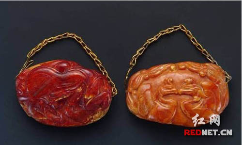 三件(套)琥珀制品,都是出自辽代陈国公主墓中。今日,湖南省博物馆举行的契丹文物开箱布展工作时,三件精美的琥珀制品,带着契丹文化的神秘色彩,展示着它们的宗教文化和生死观念的信仰。