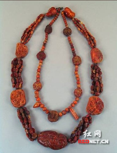 今天最后一件开箱的文物琥珀璎珞,是深具契丹民族特色的项饰。