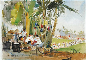 通过《海南岛风光》,我们看到,满怀激情的吴先生当时不仅用油彩来画出心中的宝岛风光,还用水彩记录了眼中的海南人文,诸如《义务劳动》、《看戏去》、《假日》、《渡口》等。