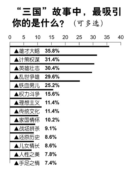 在有关“三国”的故事中,最吸引青年的是什么?本次调查中,排在前四位的分别是:“雄才大略”(35.8%)、“计策权谋”(31.4%)、“英雄壮志”(30.4%)、“乱世争雄”(29.6%)。