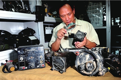 昨天,在潘家园旧货市场,韩建京向记者展示了他收藏的二战期间“驼峰航线”飞机部件。飞机部件品相完好,美国制造的标识依然清晰可见。零部件包括陀螺仪、防震盒、飞行高度表、发动机油控调节器、航速指示器等一共十多件。