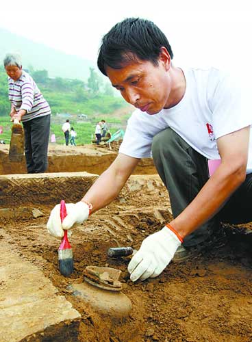 2008年6月5日,我市文物部门在石柱县西沱镇陶家坝,首次展开消落带文物发掘。担纲此次考古发掘的于桂兰向本报透露,发掘前,这片消落带墓群已经遭到了破坏,当地派出所追缴回汉代铜器、陶器各1件。