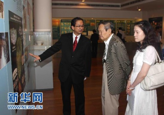 7月12日,杨振宁(前中)夫妇在参观考古展。当日,杨振宁夫妇在香港中文大学参观《毋忘香港的根》考古展览,展览以香港出土陶器、农作物等文物为基础内容。 新华社记者 汪永基 摄
