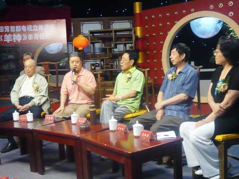 中新网7月15日电 由评书大师单田芳播讲的电视立体评书《羊神》15日在北京举行杀青仪式,此前,他的大部分作品都是以广播的形式呈现给书迷,此次《羊神》无疑达成了单老久违的心愿。