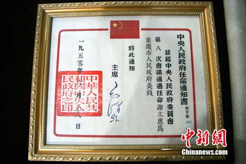 据介绍,谢云荪捐献给红岩联线的文物包括1953年中央人民政府毛泽东主席任命谢立惠为西南师范学院首任院长、1958年周恩来总理任命谢立惠为成都电讯工程学院第二任院长等四件任命书,8册中英文讲稿与手稿,谢立惠先生不同时期的生活用品及相片若干张。