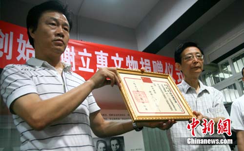 中新网重庆7月26日电 (孟幻)26日,九三学社创始人之一的谢立惠之子谢云荪专程赴渝,向重庆红岩联线无偿捐赠十余件谢立惠珍贵文物。据悉,这批文物将陈列于即将在年底建成的特园中国民主党派博物馆。