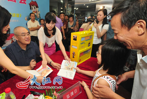 7月27日上午,著名童话大王郑渊洁携新书“ 皮皮鲁讲堂”来到南昌举行签售活动,并与南昌的小读者们一起分享自己的成长、写作经历,现场指导小读者如何写出漂亮的作文。童话大王坦言,十分怀念青年时在南昌度过的5年时光,那时候当飞机修理师的经历,对以后的人生很有帮助。