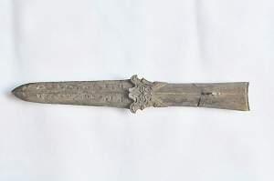 南博考古队长李则斌向记者展示了这件铜铍,带刃的前端类似短剑,长约30厘米,铜铍线条流畅优美。虽然距今至少已有2100年历史,但铍尖和锋刃没有任何缺损,黑色的铍身仍泛出幽暗的光芒,工艺之精良可与当代工艺品媲美。最令人惊叹的是铍身上的暗花纹,肉眼可以清晰可见,用手抚摸却丝毫感觉不到。这正是春秋战国时期吴越兵器特有的工艺。这些花纹究竟是怎么铸造的,至今仍是个谜。