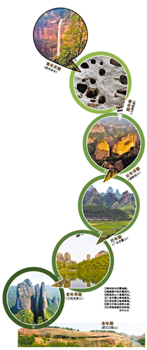 龙虎山所在的信江盆地,早白垩世火山活动、晚白垩世膏盐沉积和风沙堆积以及恐龙灾变等重大地质事件,记录了该地区白垩纪重要地质演化;突出的侵蚀残余峰丛、峰林、孤峰、残丘组合特征,表明这里属于壮年晚期-老年早期疏散峰林宽谷型丹霞的代表。