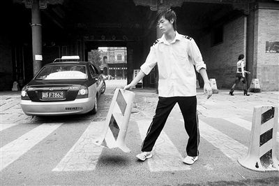 昨晚,记者在位于张自忠路的段祺瑞执政府旧址门口看到,两名停车管理员在大门口的人行横道上摆放了10个黑黄相间的障碍物。