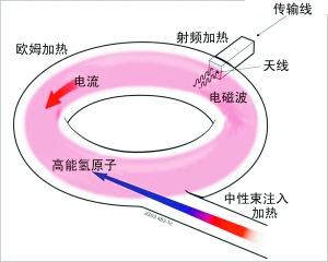 产生热核聚变的另一个重要条件就是要制造温度达1.5亿摄氏度的高温等离子区,在这种环境下,带正电的氘核和氚核才得以克服静电斥力互相碰撞。ITER使用的产生高温方法很像微波炉对食物加热。参加合作的我国科学家正在努力研究更高性能的“高功率射频加热装置”来实现它。