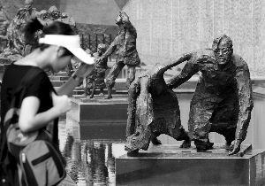 15日,一名参观者在侵华日军南京大屠杀遇难同胞纪念馆观看群雕。当日,成千上万的南京市民和海内外游客来到侵华日军南京大屠杀遇难同胞纪念馆,缅怀遇难同胞。 新华社记者 孙参 摄