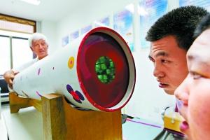 ▲ 老李参加了残联的帮扶活动,义务辅导智障人士制作简单的万花筒,进行康复训练。为了让学员们产生兴趣,他特意搬来自己制作的目前国内最大的万花筒,长达1.4米。