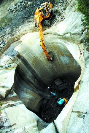 “开始还是人工挖,可怎么挖就是不收口,坑是直上直下的。”工程人员介绍,后来就调来小型挖掘机接着挖,谁知越挖越深,小型挖掘机摇臂不够长,又调来大型挖掘机。从7月17日开工,一挖就挖了一个多月。等整个大石坑全部露出来,大家才惊讶地发现,它整个镶嵌在一个巨大的花岗岩石上。康彦峻摄 RJ229