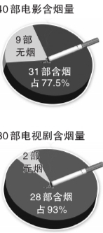 从2007年开始,中国控烟协会每年都会对热播的国产影视剧中的吸烟镜头进行监测统计。对2009年热播的40部电影和30部电视剧进行的监测结果显示:在40部电影中有9部电影完全没有烟草镜头,31部影片有烟草镜头,占影片的77.5%;30部电视剧中,2部没有烟草镜头,28部有烟草镜头,占电视剧比例的93%。