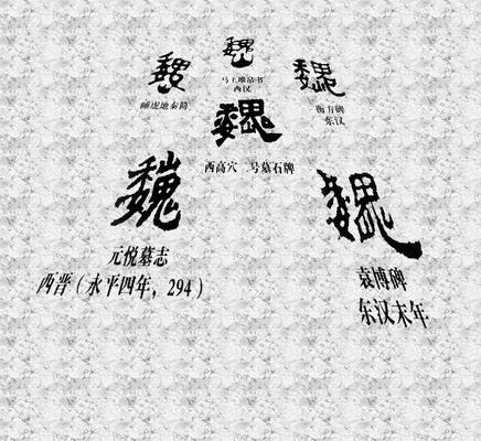 战国、秦汉至魏晋时期的“魏”字演变。居中者出自西高穴曹操墓墓石碑。