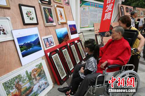 中新网成都8月28日电(刘贤 胡晓)28日,来自成都市各区(市)县的残疾人朋友们一大早便聚集到了成都市新华公园文化广场,参加由成都市残联举办的2010年残疾人文化艺术展。