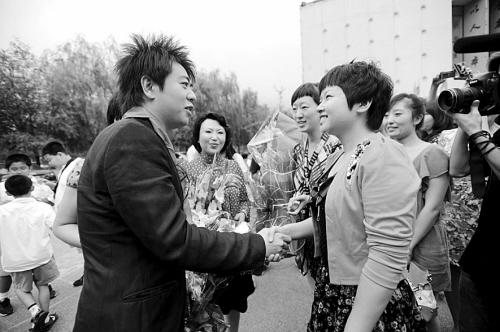 这是郎朗三天行程中最开心的一刻:五年未见的小学班主任冯凝、很多几乎近20年未见的16名小学同学,终于在浑南一校与郎朗团聚在了一起。郎朗送给了冯老师一块纪念牌匾,而冯老师则将浑南一校名誉校长的聘书送给了他。在学校,郎朗与孩子们一起弹琴,聊天,鼓励孩子们坚持梦想……而面对“失散”多年的同学们,郎朗一下子褪去了国际钢琴巨星的光环,恢复到了当年那个“人来疯”似的快乐男孩的样子。他和同学们热情拥抱,亲切地念着他们的名字,彼此回忆着上学时的趣事……这一刻,郎朗的笑容深深地洋溢在脸上。