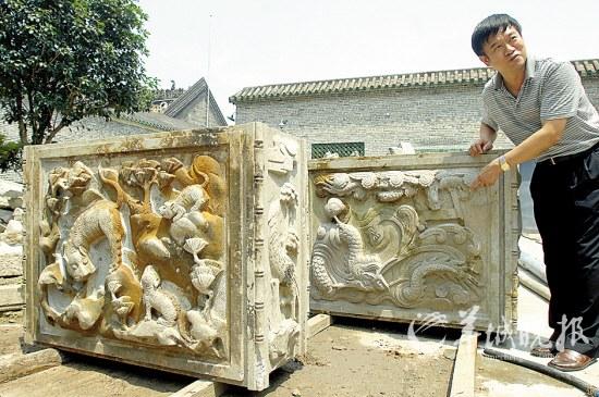 “真是令人惊喜!”陈家祠馆长李卓祺带着羊城晚报记者来到两块巨大的麻石雕刻跟前,高兴地说。两块大麻石呈长方形,四周雕有精美石刻,仔细一看,有五虎嬉戏、鲤跃龙门等,非常精美。工作人员说,两块底座于8月28日和29日被发现,高88厘米,宽120厘米,厚40厘米,四面均有精美高浮雕,雕刻有多组象征如意吉祥的纹饰,分别是“虎虎生威”、“狮子戏球五伦图”、“鱼跃龙门”、“八骏图”、“丹凤朝阳”(两组)、“创大业儿孙永发”、“石上吉祥”等。
