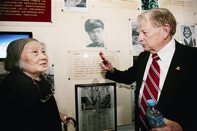 图为飞虎队老队员杰·温雅德(右一)和队员彭嘉衡的遗孀付汝梅正在参观交流。