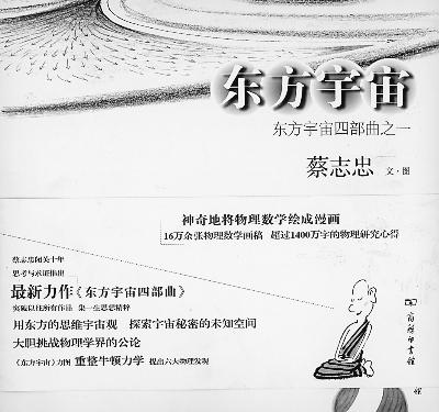 自称潜心探索理论物理学的漫画家蔡志忠,终于把10年心得付梓,一套四卷本的《东方宇宙四部曲》近日问世。这套书“以东方思维探索了宇宙秘密的未知空间”,把物理、数学理论绘成了漫画。以漫画闻名的蔡志忠何以突然对物理产生兴趣?他在思考什么?他的漫画之路会怎么延伸?记者就此采访了蔡志忠。
