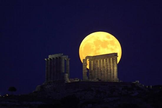在夏至那天,一轮缓缓升起的满月映衬着位于希腊雅典南部舒尼恩半岛(Sounion)上的海神波塞冬神庙。拍摄这张照片的希腊摄影师安东尼·艾因梅米缇斯(Anthony Ayiomamitis)说:“这一般景象深深地震撼了我,我想即使是那有着45亿年历史的月亮还有那2500年前建造的海神庙在这样的场景面前也会黯然失色的。”