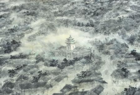 井生活为主题,工笔表现手法,采用近、中景图式。我作品则是用大全景的写意风格表现在老成都的风景,让人感受成都历史的辉煌和发展兴旺。