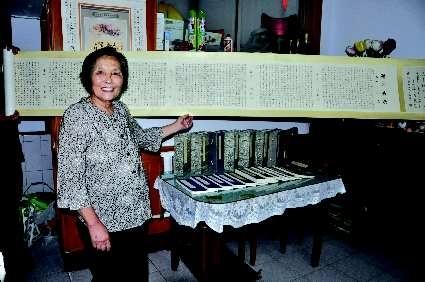 ▲陆新民老人和她的书法作品。