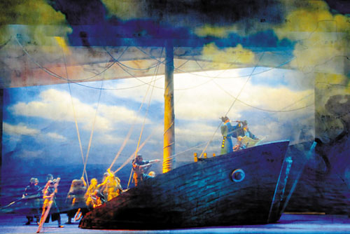 由于舞台表现的局限性,不可能将整个大船做出来,只能做出一个船头,整个船板宽约13米,高度有五六米,跟真的“南海Ⅰ号”船头尺寸差不多,且能在舞台上360度旋转。我们用最笨的办法达到最好的效果——— 做了一个船的剖面,在黑丝绒上画上各种青瓷,光泽度非常好,效果逼真。