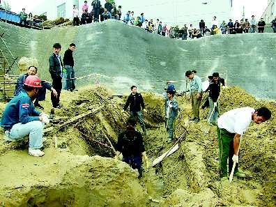 据介绍,9月17日上午10时许,菏泽国贸中心工程建设项目部B区负责人张文昌来到工地发现,几名建筑工人正在冲洗两个陶罐。工人称,这两个陶罐是在工地一角,距地面5米多深的地基处发现的。张文昌觉得这些陶罐可能是文物,就打电话报了警。菏泽市文物管理处工作人员经过一天的挖掘清理,一个古代沉船初步呈现出来。