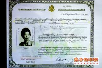 一九五五年,张爱玲以中国专才难民资格去美国,落地即时拿到“绿卡”,住满五年后,正式入籍成为公民。其后多次搬家,公民入籍证遗失,以至于办事(如授权书、立遗嘱)艰难。张爱玲要求政府补发公民入籍证,得到的回复是“查无此人”。多番困扰后才发觉政府工作人员在查找“爱玲·张”,而她纪录上的正式全名应是“爱玲·张·赖雅”。图中是补领的公民入籍证,其后用来证明身份去立遗嘱。
